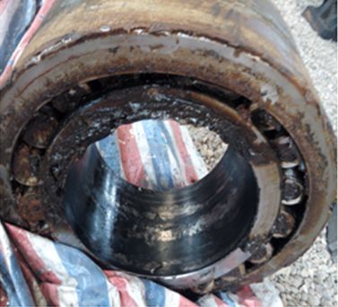 返廠修復的天輪裝置軸承座打開后,發現內部多為脂水混合物,軸承內部銹蝕嚴重,如圖8所示。在正確使用、維護及時的情況下,軸承不應出現這種問題,其原因是:軸承座端蓋密封年久老化,在露天雨水的沖擊下,雨水從失效的密封處進入軸承座內部,使得軸承潤滑不良,在重載條件下造成軸承磨損銹蝕。