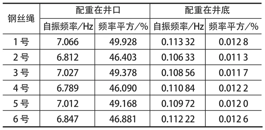 3 故障診斷分析3.1 鋼絲繩張力測試分析 鋼絲繩張力測試在 2 種工況下進行,分別是配重在井口時和配重在井底時。測試時,提升機要保持靜止狀態(tài),用小錘依次敲擊鋼絲繩,并用測振儀器記錄數(shù)據(jù)。從非驅(qū)動側(cè)到驅(qū)動側(cè)的鋼絲繩編號為 1~6,如圖 2 所示。鋼絲繩振動測試結果如表 1 所列。