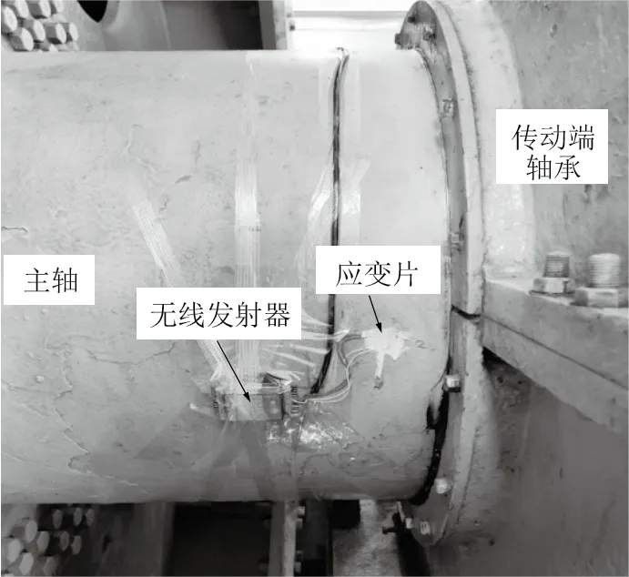 (3) 用膠水將應(yīng)變片封住,用膠帶將無線發(fā)射器固定在主軸上,防止其在提升機(jī)轉(zhuǎn)動(dòng)時(shí)被甩掉。應(yīng)變片位置如圖3 所示。