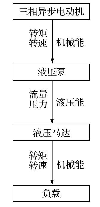 換繩機(jī)構(gòu)采用雙液壓馬達(dá)驅(qū)動(dòng),以帶動(dòng)同步帶輪和鏈輪轉(zhuǎn)動(dòng),進(jìn)行送繩,其能量傳遞過程如圖3所示。在整個(gè)能量傳遞中,受排量、效率、液壓等因素的影響,液壓馬達(dá)輸出轉(zhuǎn)矩會(huì)產(chǎn)生波動(dòng)。因此,需要通過公式推導(dǎo)得出輸出轉(zhuǎn)矩的波動(dòng)函數(shù)。