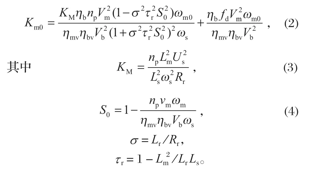 式中:np 為電動(dòng)機(jī)的極對(duì)數(shù);Vm 為液壓馬達(dá)的排量;ωs 為電網(wǎng)供電頻率;Ls、Lr、Lm 分別為定子電感、轉(zhuǎn)子電感以及定子與轉(zhuǎn)子之間的互感;Us 為端電壓。